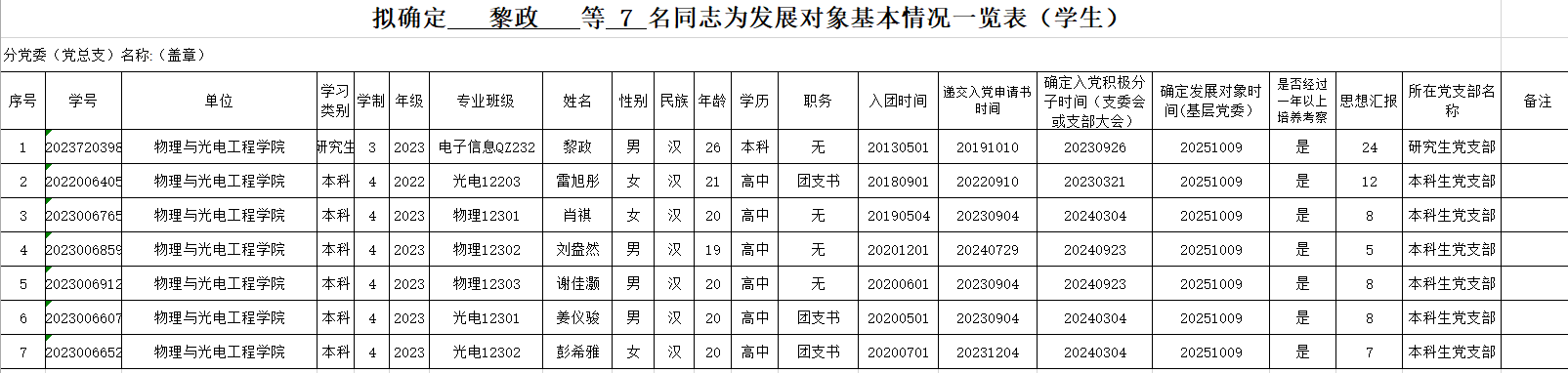 经党支部培养教育和考察,在听取培养联系人、党员和群众意见的基础上,经支部委员会会议讨论决定并报物电学院党委备案同意, 2025 年 10 月 9 日确定 黎政 等 7 名同志为发展对象。为保证发展新党员的质量,加强对发展党员工作的民主监督,现对发展对象进行公示。
