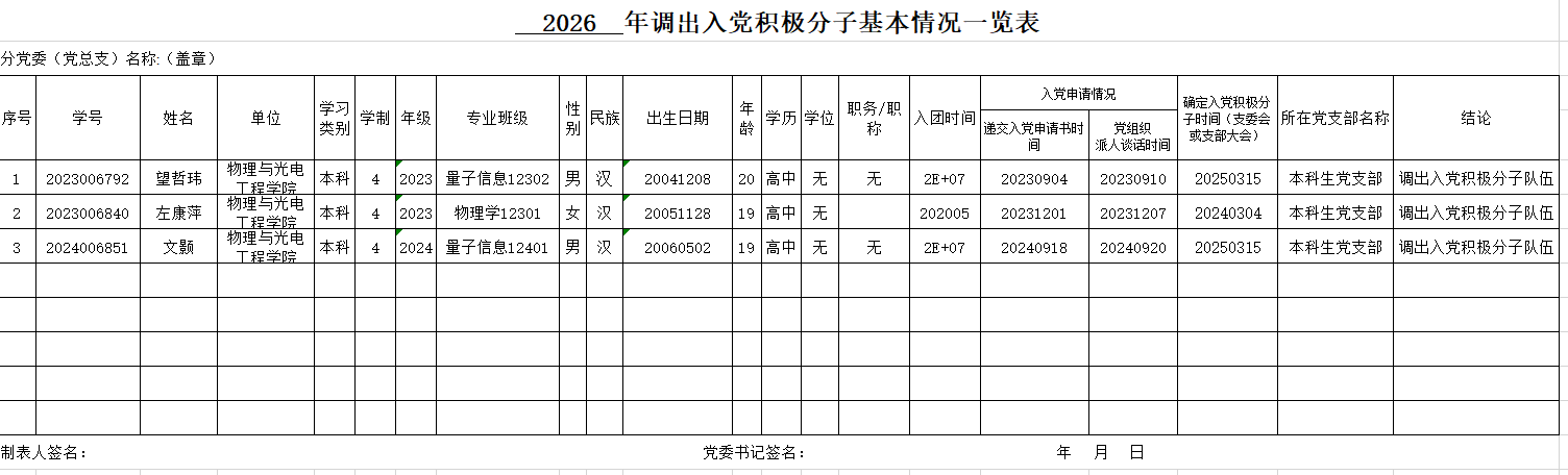 为加强入党积极分子的培养、管理和教育,保证党员发展质量,根据《物电学院入党积极分子动态管理办法》规定,经所在党支部严格审查,支部委员会会议讨论决定,并报物电学院党委备案,拟将 望哲玮 等 3 名同学调出入党积极分子队伍,按入党申请人身份对待,现予以公示。公示时间:2026年 3月 16日至 2026年 3月 22日。