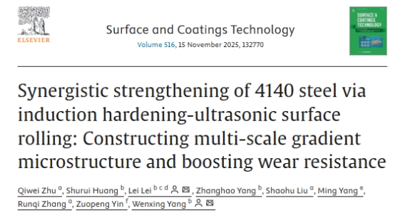 近日,长江大学物理与光电工程学院雷磊副教授在石油装备关键部件表面强化技术领域取得新进展,研究成果以“Synergistic strengthening of 4140 steel via induction hardening-ultrasonic surface rolling: Constructing multi-scale gradient microstructure and boosting wear resistance”为题,发表于国际期刊《Surface & Coatings Technology》(JCR一区期刊)。长江大学为第一作者单位,我院雷磊副教授与杨文星教授为共同通讯作者。