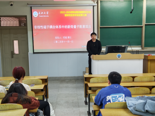 邓旭博士的报告题目是《非线性磁子耦合体系中的新奇量子阻塞效应》。磁性材料(如铁磁、亚铁磁和反铁磁体)与相干光场组成的混合量子系统—腔磁系统,已经成为研究量子光学领域新的量子技术平台。在外加静磁场中的磁性材料(如YIG晶体)中出现大量集体自旋的有序激发(磁子),由于磁子具有阻尼率低、相干时间长和无热耗散等优势,成为了量子信息的有效载体。该报告围绕具有二阶非线性材料(如铌酸锂)提供的简并光学参量放大效应,在多种腔磁系统中探索了新奇的量子阻塞效应,其物理机制在于双量子激发路径之间完全量子干涉的出现与消失。研究成果为创建单量子源以及指导新型低功耗非互易单量子器件的设计方面提供了重要理论依据。