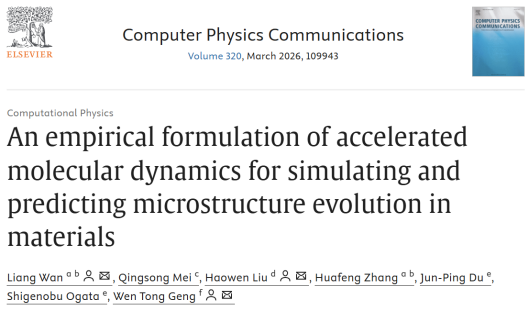 (通讯员 余紫钧)近日,我院万亮副教授与武汉大学、浙江师范大学以及日本大阪大学等国内外多所高校的研究人员共同合作,在加速分子动力学模拟新方法开发方面取得重要进展,提出了一种名为“Shuffling Accelerated Molecular Dynamics(SAMD,原子重排加速分子动力学)”的分子动力学加速方法,有望显著提升对材料微观结构演化过程的模拟能力。研究成果以“An empirical formulation of accelerated molecular dynamics for simulating and predicting microstructure evolution in materials”为题,发表于国际物理学期刊《Computer Physics Communications》。万亮副教授为第一作者兼共同通讯作者,长江大学为第一单位。