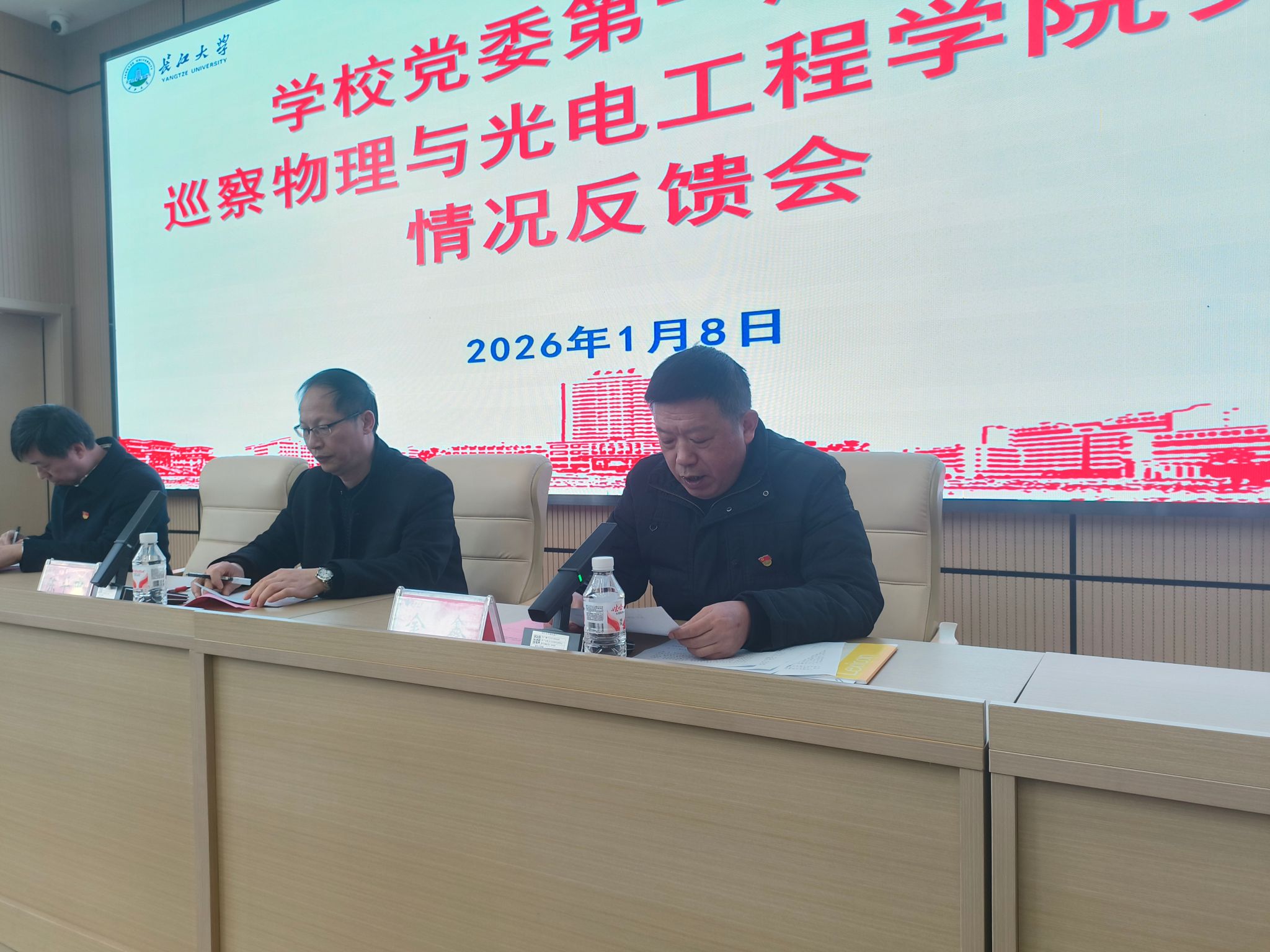 (通讯员 梁军)2026年1月8日下午,校党委第一巡察组巡察物理与光电工程学院党委情况反馈会在石油报告厅召开。校纪委副书记、党委巡察办主任陈平中,党委第一巡察组组长金鑫,第一巡察组全体成员出席会议。会议由物电学院党委书记凌新华主持。