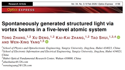 近日,物理与光电工程学院杨文星教授团队在国际光学权威期刊《Optics Express》(中科院二区,IF=3.3)上发表了题为“Spontaneously generated structured light via vortex beams in a five-level atomic system”的研究论文。长江大学为唯一署名单位,博士生张桐为第一作者,水涛副教授和杨文星教授为共同通讯作者。该研究在相干驱动的五能级冷原子系统中创新性地提出了一种利用携带轨道角动量的涡旋光束操控原子自发辐射谱的方案,为结构化光场的产生、光通信与光学存储等领域提供了全新的理论路径。