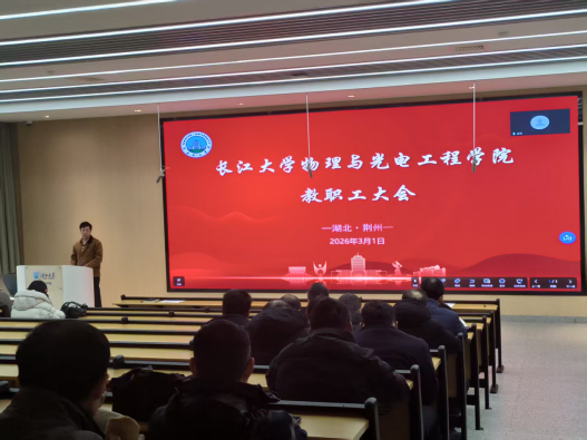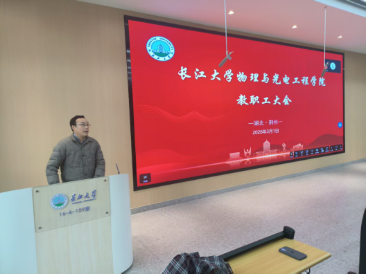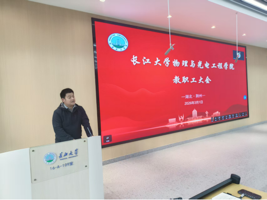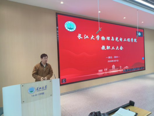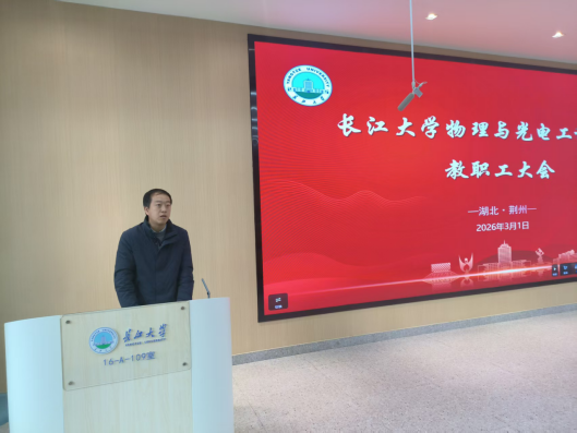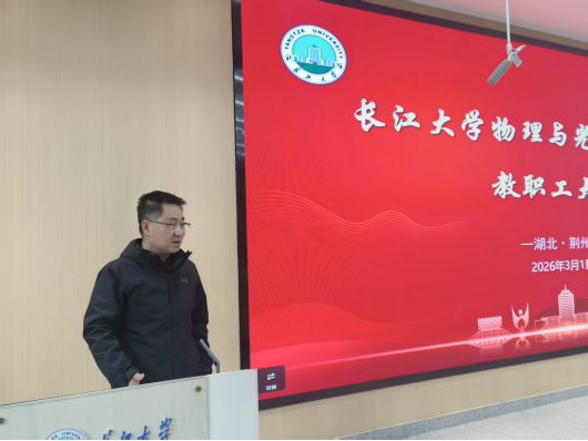 会上,院长张华峰传达了校领导新学期工作交流会、长江大学学院(部)2025年度工作报告会等相关会议精神,对全院教职工的辛勤付出和取得的成绩予以肯定。他回顾了过去一年学院在科研成果、人才培养、教育教学、学科建设、师资队伍建设等方面取得的显著成绩,梳理了学院发展存在的不足,明确了2026年的工作目标,对新学期重点工作特别是物理学一级学科博士点申报进行了谋划布局。要求全体教职工统一思想、明确任务,提升师德师风建设水平,聚焦学院发展,推动学院事业迈向新台阶。