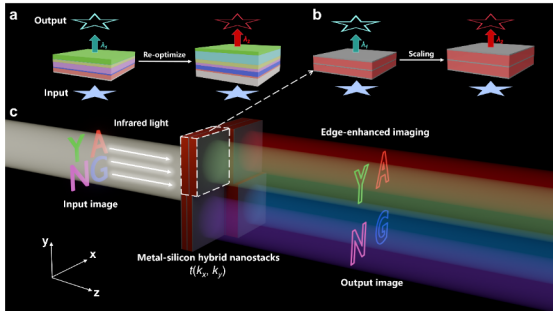 基于纳米光子学器件的光学图像处理策略,利用微纳结构的光学响应对光波波矢进行操控,能够有效地滤除或保留目标图像的低频/高频分量。相较于数字图像处理,全光学图像处理直接在光传播过程中完成信号的提取,无需额外的光电转换,具有速度快、能耗低的优势。基于此,研究团队构建了一种银/硅/银/硅/银的五层纳米薄膜堆叠结构,该结构具有强烈的角度依赖的光学响应特性,能够在特定波长下对空间频率的低频分量进行滤除,同时保留高频分量,进而实现近红外波段的边缘增强成像的功能。由于纳米腔干涉共振导致的波长选择性,通过调整硅层的厚度,该纳米堆叠薄膜的工作波长能够在850-1250 nm范围任意定制,无需复杂的优化设计。此外,所提出的纳米薄膜堆叠结构与半导体镀膜工艺兼容,并且易于集成到任意的紧凑型光学成像系统中,有望在光学模拟计算和智能图像识别等领域得到实际应用。
