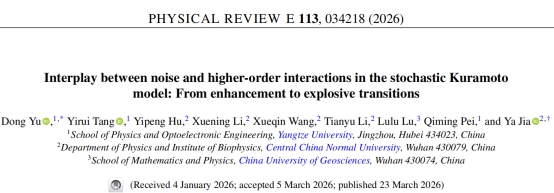 (通讯员 余紫钧)近日,物理与光电工程学院裴启明教授团队在《PHYSICAL REVIEW E》上发表了题为 “Interplay between noise and higher-order interactions in the stochastic Kuramoto model: From enhancement to explosive transitions” 的研究论文。《PHYSICAL REVIEW E》由美国物理学会(American Physical Society)于2001年创办,是聚焦多体系统集体现象的跨学科期刊,该刊核心研究方向涵盖统计物理、非线性动力学、生物物理、软物质物理及流体与等离子体物理领域,在数学物理领域具有较高学术影响力。余东教授为论文第一作者兼通讯作者,华中师范大学贾亚教授为共同通讯作者,长江大学为第一署名单位。