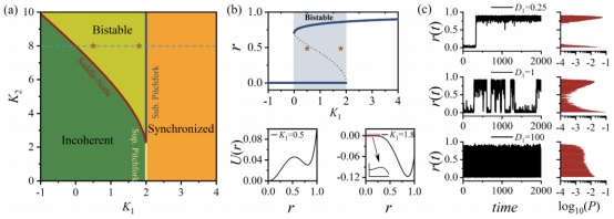 同步现象广泛存在于物理、生物和社会系统中,是复杂系统集体动力学研究中的重要问题。近年来,高阶相互作用被认为是影响复杂网络同步行为的重要机制,但噪声与高阶相互作用的耦合作用规律仍缺乏系统认识。围绕这一问题,研究团队以随机 Kuramoto 模型为基础,深入分析了噪声与高阶相互作用共同作用下的集体动力学行为。