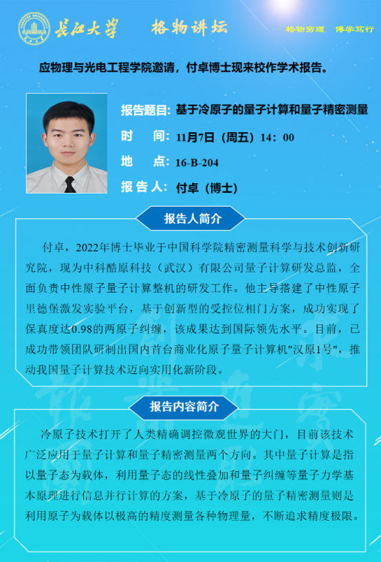 物电学院2025年学术报告第十七讲-基于冷原子的量子计算和量子精密测量