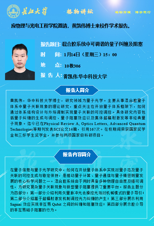 物电学院2026年学术报告第三讲-混合腔系统中可调谐的量子纠缠及阻塞