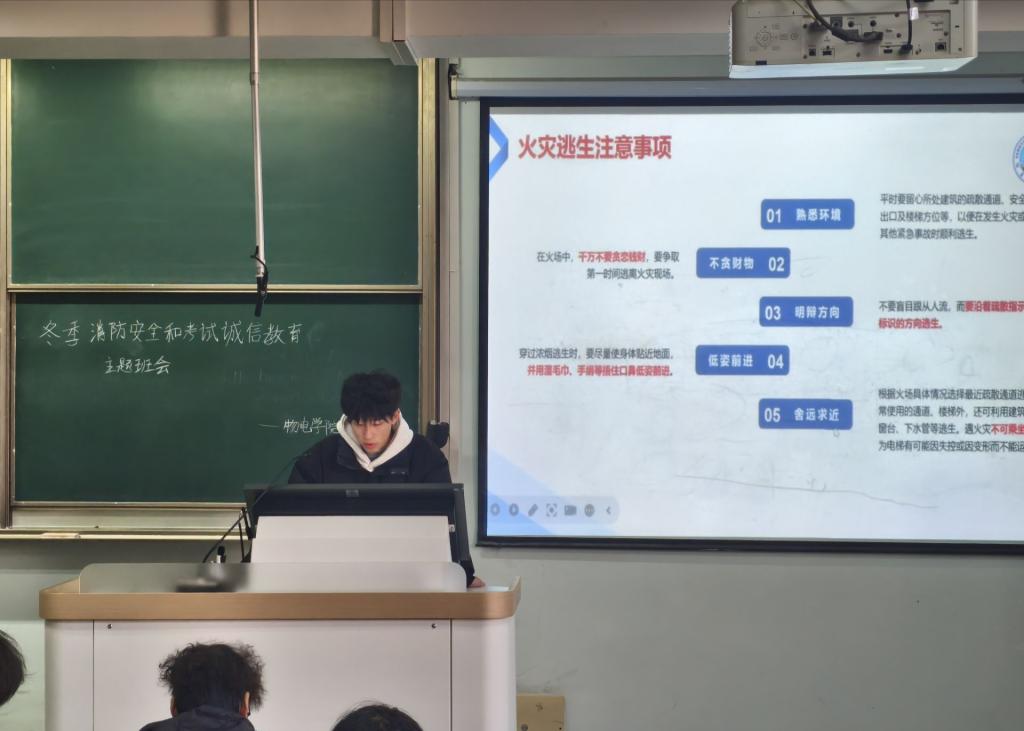 活动以班级主题班会为主要形式。班会上,班主任带领学生学习《国家教育考试违规处理办法》《长江大学学生违纪处分办法》等内容,结合学校近年违纪典型案例,剖析考试作弊的学业与诚信危害,引导学生树立“诚信应考光荣,违纪作弊可耻”的观念;同时通过火灾案例视频等,普及冬季消防安全知识,尤其是教学楼、宿舍、实验室等场所的消防安全隐患及逃生与自救技巧,强化安全防范意识。