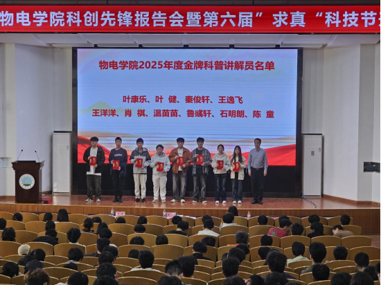 随后,作为科创先锋的王嘉琪、吴艳萍、兰飞翔三位优秀学生代表依次登台分享参赛经验,他们以所学专业的角度为依托,介绍了各位学科竞赛的时间,前期如何备赛以及在竞赛过程中的注意事项,给同学们做了详尽的介绍,同学们听完分享后纷纷表示:极大地激发了参与竞赛的兴趣,增强了竞赛获奖的信心。大会还对2025年度量子物理“优秀科普讲解员”及“金牌科普讲解员”进行了表彰,进一步激发了学生参与科创实践的热情。