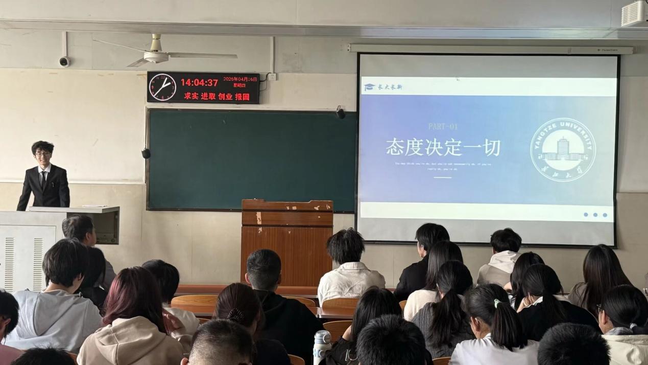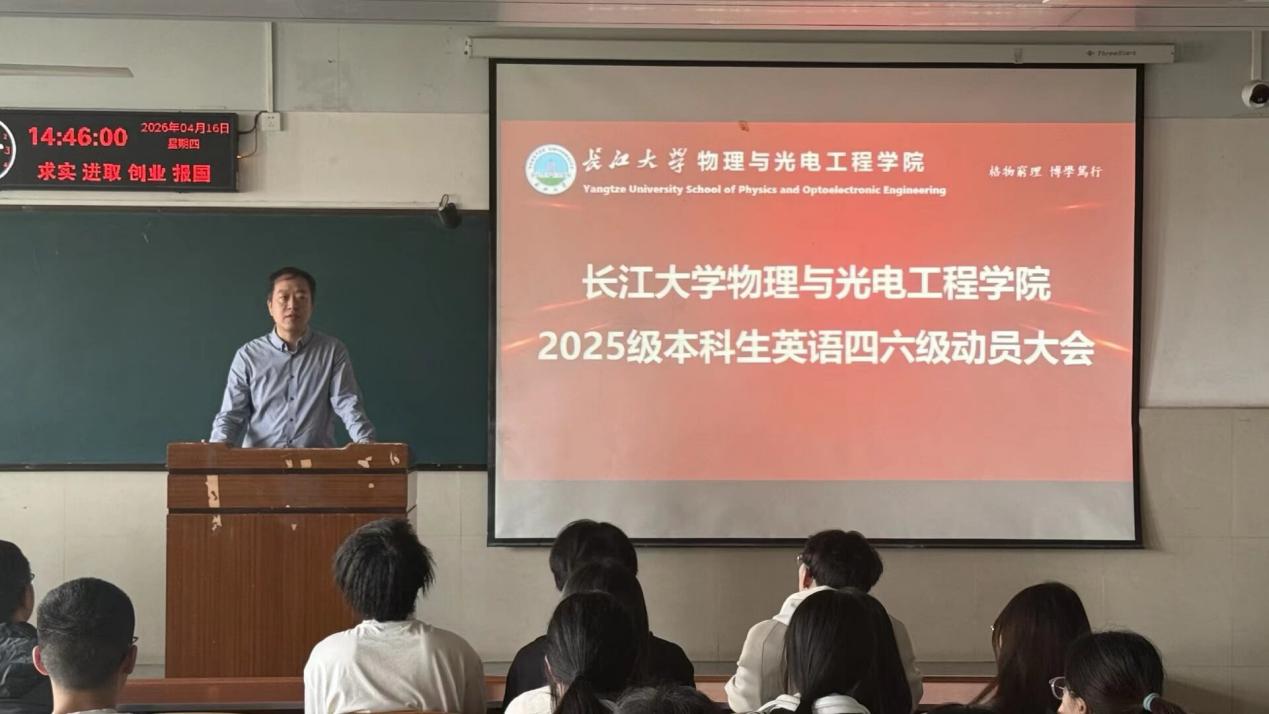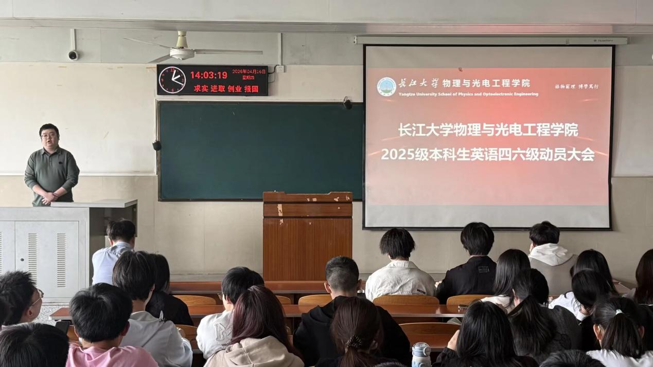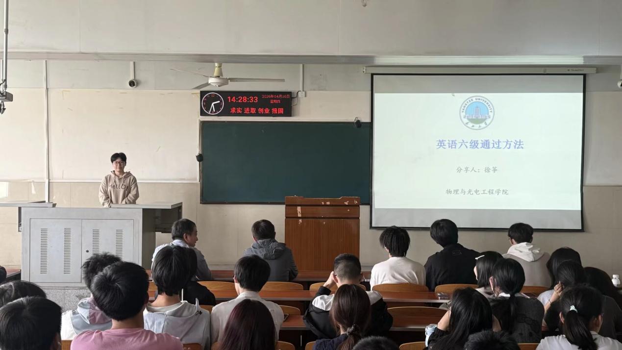 (通讯员:梁建军)4月16日下午,物电学院于12教502召开本科生英语四六级动员大会。学院党委副书记王宁,辅导员邱浩然及全体2025级本科生参加会议。会议特别邀请学长学姐分享英语四六级备考经验,为大家指点迷津,鼓舞士气。